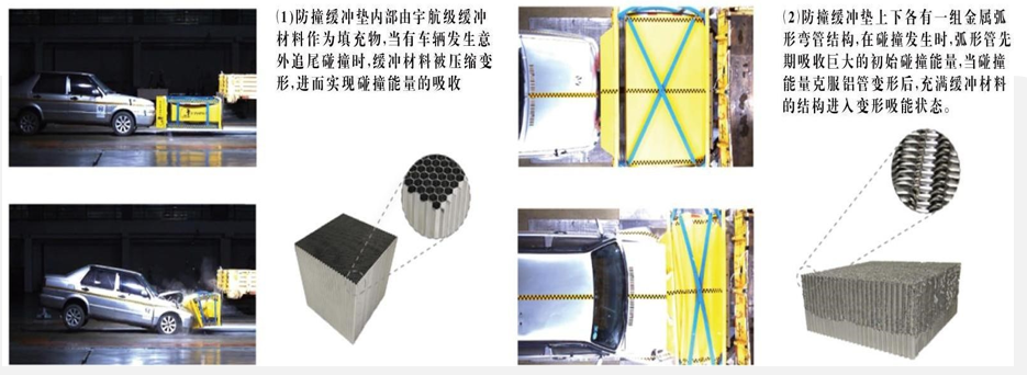 当有车辆发生意外追尾碰撞时,缓冲材料被压缩变形,进而实现碰撞能量的吸收。防撞缓冲垫上下各有一组金属弧形弯管结构,在碰撞发生时,弧形管先期吸收巨大的初始碰撞能量,当碰撞能量克服铝管变形后,充满缓冲材料的结构进入变形吸能状态。